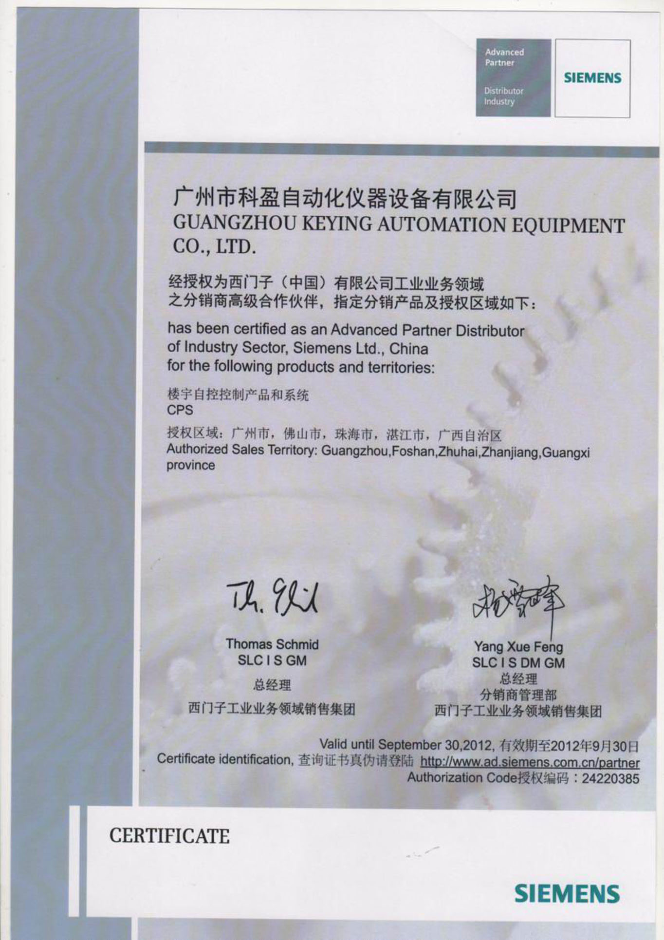 2012年西門子授權(quán)書
