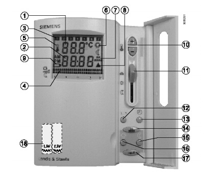 數(shù)字顯示屏顯示實(shí)際室溫,時(shí)間,日期,當(dāng)前開關(guān)模式和當(dāng)前運(yùn)行模式符號(hào)。 帶閃光時(shí)間指示器的開關(guān)模式在正常模式時(shí)顯示雙桿,在節(jié)能模式時(shí)顯示單桿。供熱輸出時(shí),顯示三角形符號(hào)。