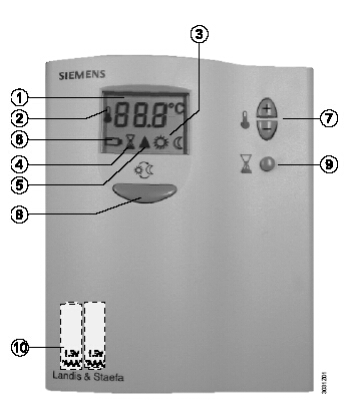 數(shù)字顯示屏顯示實(shí)際室溫和當(dāng)前運(yùn)行模式符號。供熱輸出時,顯示三角形符號。當(dāng)自動模式切換啟動時,就會出現(xiàn)沙漏型標(biāo)志。